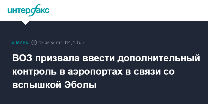 Москва. 18 августа. INTERFAX.RU - Всемирная организация здравоохранения (ВОЗ) призывает власти африканских стран, затронутых лихорадкой Эбола, ввести медосмотр людей, покидающих аэропорты, передает в понедельник агентство AP со ссылкой на заявление ВОЗ.