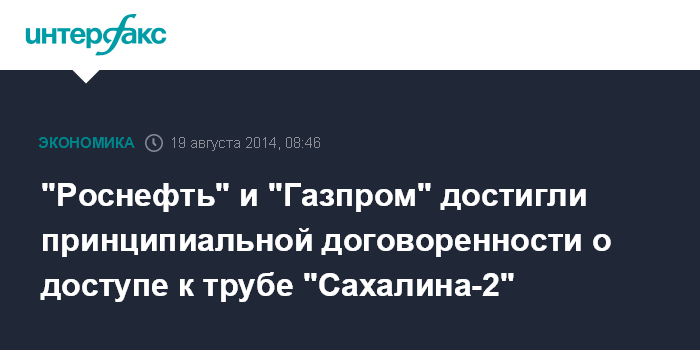 Москва. 19 августа. INTERFAX.RU - "Роснефть" и "Газпром" достигли принципиальной договоренности по вопросу доступа нефтяной компании к газопроводу "Сахалина-2", сообщила в интервью газете "Коммерсантъ" руководитель газового направления, вице-президент "Роснефти" Влада Русакова.