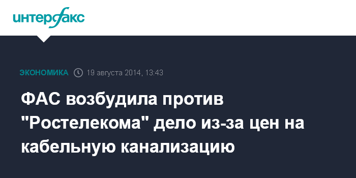 Москва. 19 августа. INTERFAX.RU - Федеральная антимонопольная служба (ФАС) возбудила дело в отношении ОАО "Ростелеком" по жалобам других операторов на значительное повышение госкомпанией цен на доступ к кабельной канализации.