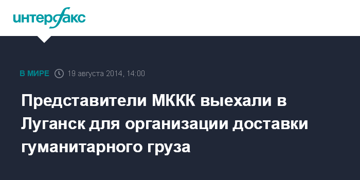 Москва. 19 августа. INTERFAX.RU - В Луганск отправилась передовая группа представителей Международного комитета Красного Креста (МККК), задачей которых будет оценка обстановки и организация доставки гуманитарной помощи жителям города, сообщил СНБО Украины.