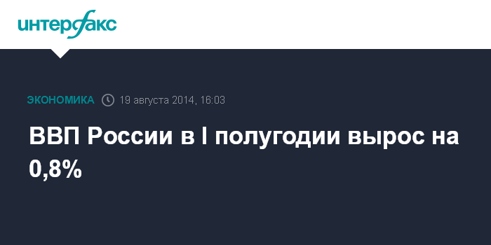 Москва. 19 августа. INTERFAX.RU - Москва. 19 августа. INTERFAX.RU - ВВП РФ в I полугодии 2014 года вырос по сравнению с аналогичным периодом прошлого года на 0,8%. Такую оценку распространил во вторник Росстат.