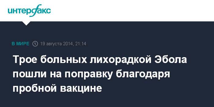 Москва. 19 августа. INTERFAX.RU - Трое инфицированных вирусом Эбола медицинских работников в Либерии почувствовали себя значительно лучше после введения экспериментальной вакцины, говорится в заявлении министерства информации Либерии, распространенном во вторник.