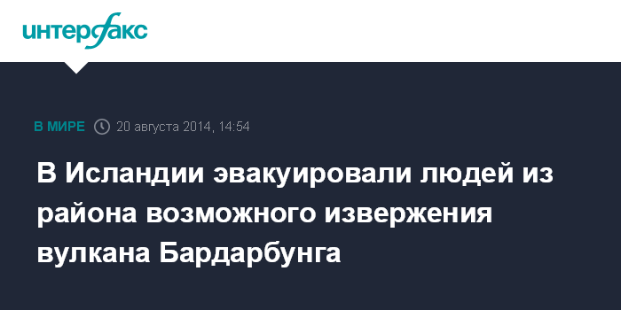 Москва. 20 августа. INTERFAX.RU - Власти Исландии провели эвакуацию людей в северной части ледника Ватнайокюдль вблизи вулкана Бардарбунга в связи с интенсивной сейсмической активностью, которая может означать скорое извержение, сообщает издание The Reykjavik Grapevine.