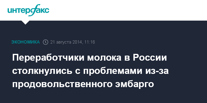 Москва. 21 августа. INTERFAX.RU - Запрет на поставки молока и молочной продукции из ряда стран, прежде всего из ЕС и Австралии, может создать проблемы для некоторых крупных производителей молочной продукции в России.