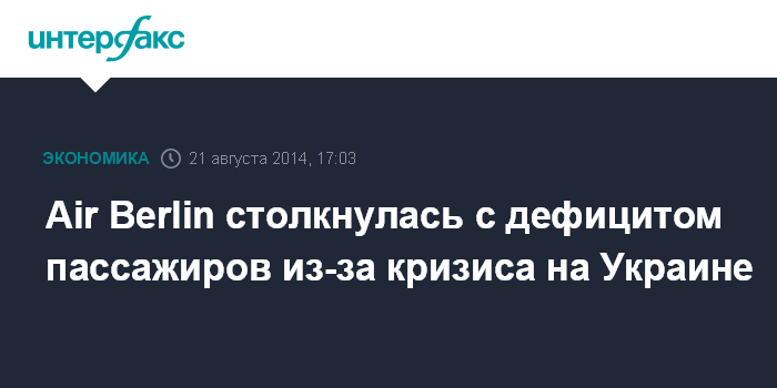 Москва. 21 августа. INTERFAX.RU - Вторая по величине немецкая авиакомпания Air Berlin сообщила в четверг о падении спроса на российском и украинском рынках и не исключила снижения перевозок.