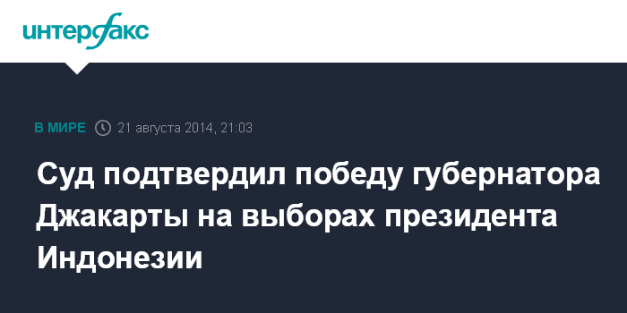 Москва. 21 августа. INTERFAX.RU - Конституционный суд Индонезии подтвердил победу бывшего губернатора особого столичного округа Джакарта Джоко Видодо на президентских выборах. Об этом объявил председатель суда Хамдан Зелва.
