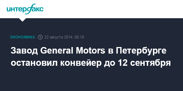 Москва. 22 августа. INTERFAX.RU - Завод General Motors в Санкт-Петербурге "Джи Эм Авто" в пятницу останавливает конвейер до 12 сентября 2014 года.