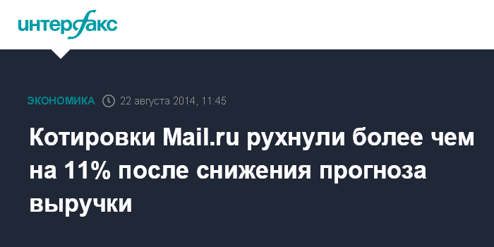 Москва. 22 августа. INTERFAX.RU - Котировки GDR Mail.ru Group на LSE в пятницу рухнули более чем на 11% после того, как компания объявила о значительном снижении прогноза по выручке на 2014 год. По состоянию на 11:30 мск падение составляло более 12%, к 11:37 мск оно скорректировалось до 11,29% ($28,96 за GDR).