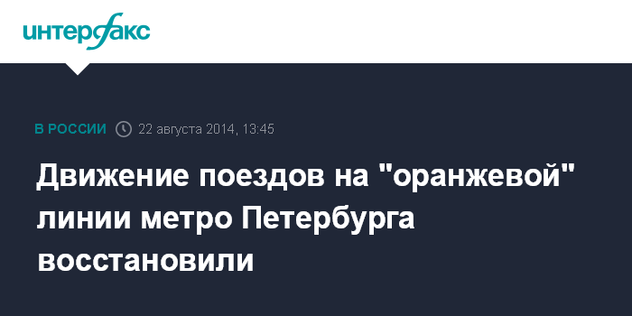 Москва. 22 августа. INTERFAX.RU - Восстановлено движение поездов на "оранжевой" ветке петербургского метрополитена, сообщили "Интерфаксу" в пресс-службе метро.