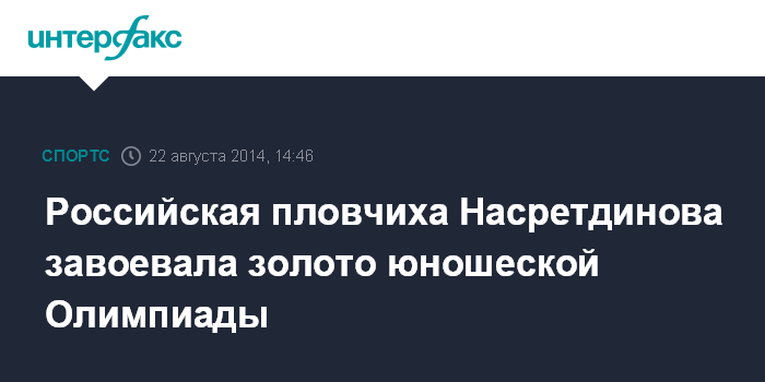 Москва. 22 августа. INTERFAX.RU - Россиянка Розалия Насретдинова стала чемпионкой юношеских Олимпийских игр в Нанкине на дистанции 50 метров вольным стилем.