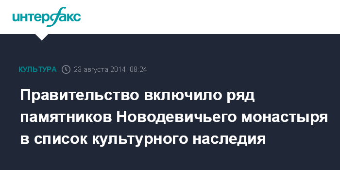 Москва. 23 августа. INTERFAX.RU - Премьер-министр РФ Дмитрий Медведев подписал распоряжение, в соответствии с которым в реестр объектов культурного наследия включен ряд памятников ансамбля Новодевичьего монастыря в Москве. Документ разработан министерством культуры России.