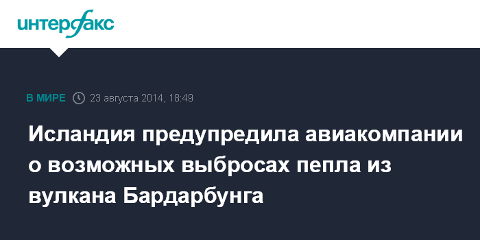 Москва. 23 августа. INTERFAX.RU - Власти Исландии объявили "красную тревогу" для летающих в регионе авиакомпаний в связи с возможными выбросами пепла из вулкана Бардарбунга на юго-востоке страны, сообщает BBC News.