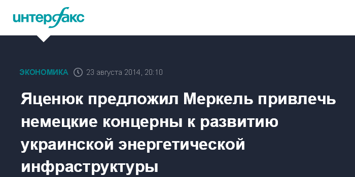 Москва. 23 августа. INTERFAX.RU - Премьер-министр Украины Арсений Яценюк обсудил с федеральным канцлером Германии Ангелой Меркель в ходе встречи в Киеве вопросы энергетической безопасности, сообщила пресс-служба украинского правительства.