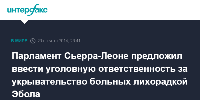 Москва. 23 августа. INTERFAX.RU - Парламент Сьерра-Леоне принял закон, согласно которому предоставление жилья человеку, больному лихорадкой Эбола, становится уголовным преступлением, сообщает BBC.
