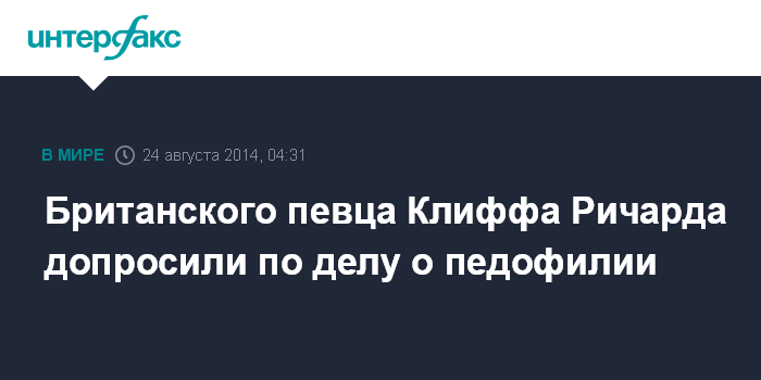 Москва. 24 августа. INTERFAX.RU - Британская полиция допросила певца Клиффа Ричарда в рамках давнего дела о сексуальных домогательствах, сообщила BBC News со ссылкой на представителя артиста.