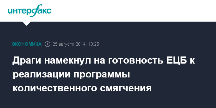 Москва. 25 августа. INTERFAX.RU - Председатель Европейского центрального банка (ЕЦБ) Марио Драги использовал выступление на симпозиуме в Джексон-Хоуле, чтобы заложить основы собственной версии программы количественного смягчения (QE) в еврозоне, считают эксперты. В нейтральных формулировках, традиционных для руководителей ведущих центробанков, глава ЕЦБ заявил: "Мы готовы дополнительно скорректировать позицию в области денежно-кредитной политики".