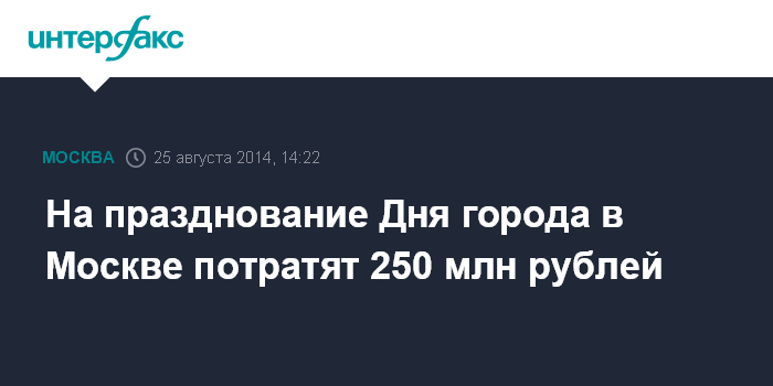 Москва. 25 августа. INTERFAX.RU - На празднование Дня города, которое в Москве в этом году пройдет 6 и 7 сентября, будет потрачено 250 млн рублей, сообщил глава столичного департамента культуры Сергей Капков на пресс-конференции в понедельник.
