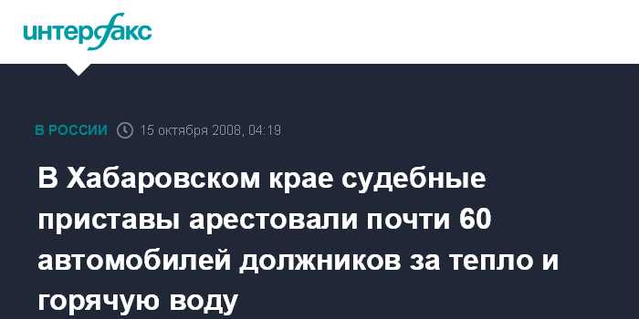 Хабаровск. 15 октября. ИНТЕРФАКС-ДАЛЬНИЙ ВОСТОК - Судебные приставы в сентябре наложили арест на 12 автомобилей, принадлежащих жителям Хабаровска и Комсомольска-на-Амуре, которые задолжали энергетикам за тепло и горячую воду 170 тыс. рублей.