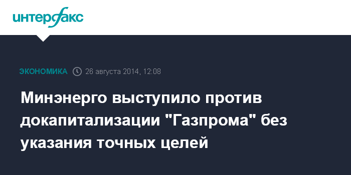Москва. 26 августа. INTERFAX.RU - Министерство энергетики России выступило против докапитализации "Газпрома" без указания точных целей финансирования. "Мы считаем невозможным принятие решения о докапитализации до предоставления компанией подробных сведений о том, на что именно пойдут дополнительные средства", - сообщили "Интерфаксу" в пресс-службе Минэнерго.