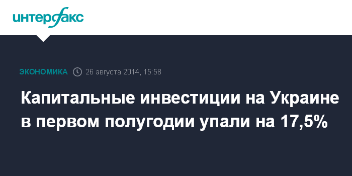 Москва. 26 августа. INTERFAX.RU - Капитальные инвестиции на Украине в первом полугодии 2014 года сократились на 17,5% по сравнению с аналогичным периодом 2013 года, тогда как по итогам первого квартала спад составлял 23,1%, сообщила Государственная служба статистики.