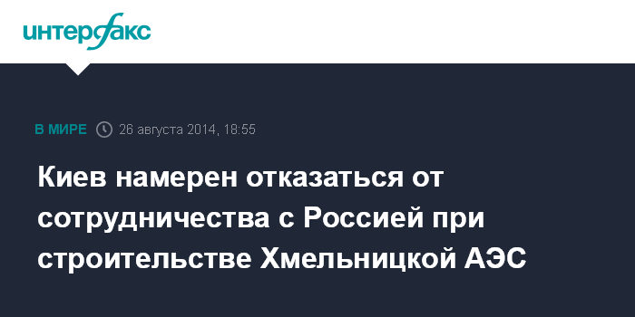 Москва. 26 августа. INTERFAX.RU - Украина намерена отказаться от сотрудничества с Россией при строительстве третьего и четвертого энергоблоков Хмельницкой атомной электростанции (ХАЭС), сообщил президент НАЭК "Энергоатом" Юрий Недашковский.