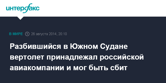 Ранее во вторник агентство Associated Press со ссылкой на заявление ООН сообщило о крушении в Южном Судане грузового вертолета, использующегося миссией ООН. В ООН заявили, что обеспокоены судьбой экипажа. К месту крушения недалеко от города Бентиу направлена поисковая группа. Между тем источник агентства в ООН на условиях анонимности сообщил, что вертолет, скорее всего, был сбит.