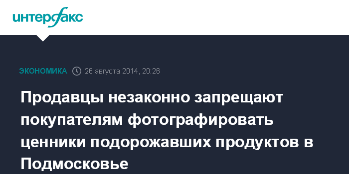 Москва. 26 августа. INTERFAX.RU - Жители Подмосковья активно присылают в Минпотребрынка региона фотографии ценников и адреса магазинов, где необоснованно подорожали продукты питания, однако многие из них сталкиваются с запретами фотосъемки ценников на прилавках, сообщила пресс-служба министерства во вторник.