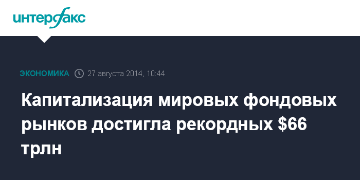 Москва. 27 августа. INTERFAX.RU - Капитализация фондовых рынков мира - от Бразилии до Японии - по итогам торгов во вторник достигла рекордных $66 трлн, сообщает агентство Bloomberg. На докризисном пике 2007 года мировые акции в совокупности стоили около $63 трлн, к марту 2009 года (текущий многолетний минимум) их капитализация рухнула до $25 трлн.