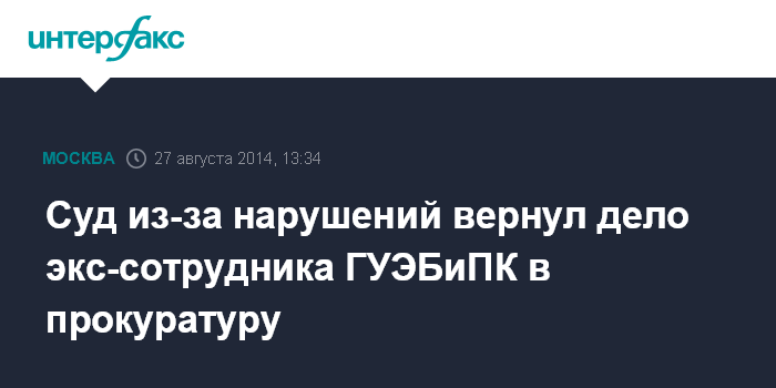 Москва. 27 августа. INTERFAX.RU - Измайловский суд Москвы в среду вернул прокурору дело в отношении экс-сотрудника Главного управления экономической безопасности и противодействия коррупции (ГУЭБиПК) МВД Алексея Клюшкина, обвиняемого в превышении должностных полномочий. Судья попросила устранить допущенные в обвинительном заключении нарушения УПК РФ, которые препятствуют вынесению приговора.