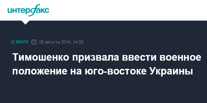 Москва. 28 августа. INTERFAX.RU - Лидер партии "Батькивщина" Юлия Тимошенко считает необходимым немедленно ввести военное положение на юго-востоке Украины. Об этом она заявила в четверг журналистам в Киеве.