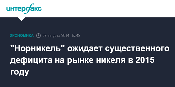 Москва. 28 августа. INTERFAX.RU - Крупнейший мировой производитель никеля "Норникель", ожидает "небольшой" рост предложения на рынке никеля за счет ввода новых латеритных проектов. Однако это не сможет компенсировать увеличение потребления, что приведет рынок к существенному дефициту в 2015 году, следует из пресс-релиза компании по итогам отчетности за I полугодие по МСФО.