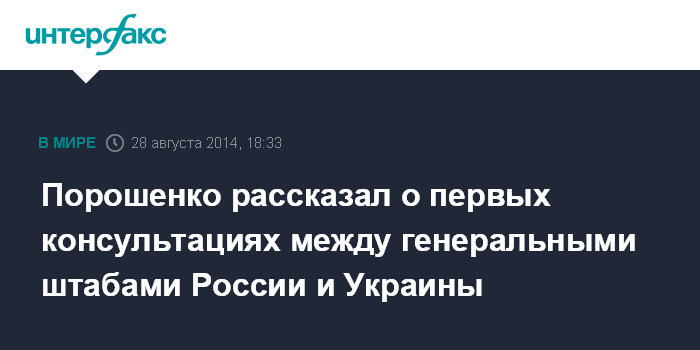 Москва. 28 августа. INTERFAX.RU - Первые консультации между генеральными штабами вооруженных сил Украины и России прошли в четверг. Об этом сообщил президент Украины Петро Порошенко на заседании Совета национальной безопасности и обороны в Киеве.