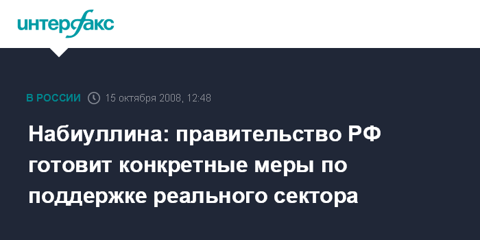 Москва. 15 октября. INTERFAX.RU - Правительство РФ готовит конкретные меры по поддержке реального сектора экономики, заявила глава Минэкономразвития РФ Эльвира Набиуллина журналистам в среду в Москве.