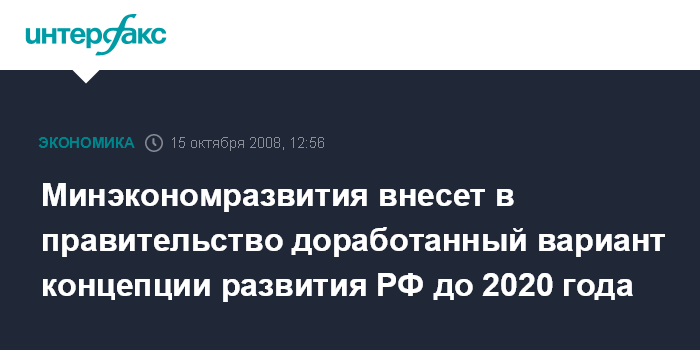Москва. 15 октября. INTERFAX.RU - Минэкономразвития РФ в среду внесет в правительство доработанный вариант концепции долгосрочного развития РФ до 2020 года, сообщил журналистам заместитель министра экономического развития Андрей Клепач. "Планируем сегодня внести в правительство доработанный вариант концепции", - сказал он.