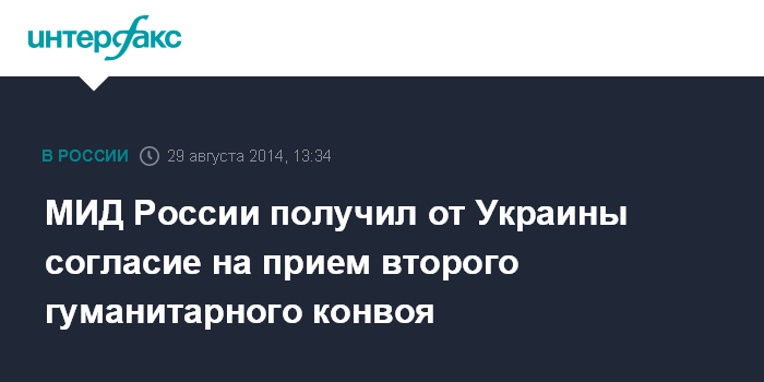 Москва. 29 августа. INTERFAX.RU - МИД РФ получил ответную ноту от украинской стороны с согласием на прохождение второго гуманитарного конвоя на территорию Украины, заявил глава МИД РФ Сергей Лавров.