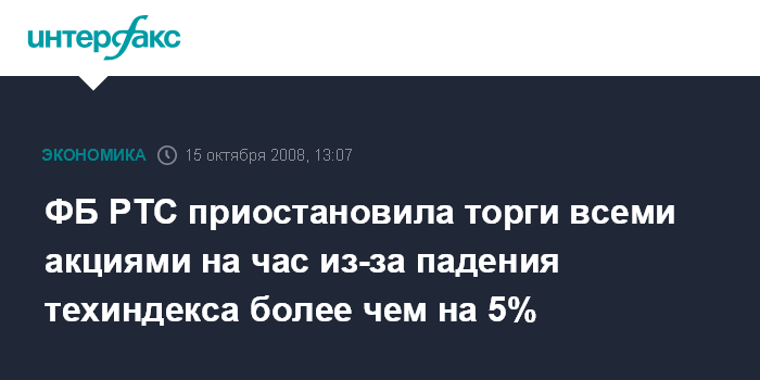 Москва. 15 октября. INTERFAX.RU - Фондовая биржа РТС приостановила в среду торги всеми акциями с 13:05 МСК на час из-за падения технического индекса биржи более чем на 5% к уровню предыдущего дня, сообщила биржа.
