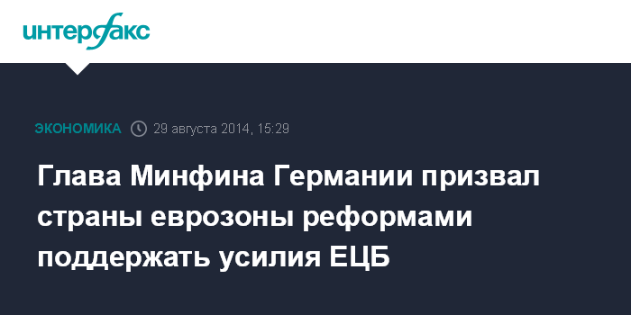 Москва. 29 августа. INTERFAX.RU - Европейский центральный банк (ЕЦБ) исчерпал все способы поддержки экономики еврозоны, и сейчас ответственность за экономический рост без увеличения дефицита бюджета ложится на правительства отдельных стран, заявил министр финансов Германии Вольфганг Шойбле в интервью агентству Bloomberg.