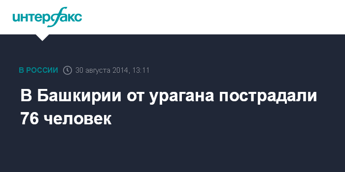 Москва. 30 августа. INTERFAX.RU - По последним данным, в результате шквалистого ветра в трех районах Башкирии пострадали 76 человек, сообщили в субботу "Интерфаксу" в пресс-службе Минздрава республики.