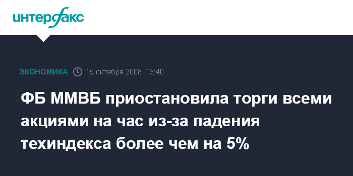 Москва. 15 октября. INTERFAX.RU - Фондовая биржа ММВБ приостановила в среду торги всеми акциями в основном режиме с 13:35 МСК на час из-за падения технического индекса биржи более чем на 5% к уровню предыдущего дня, сообщила биржа.