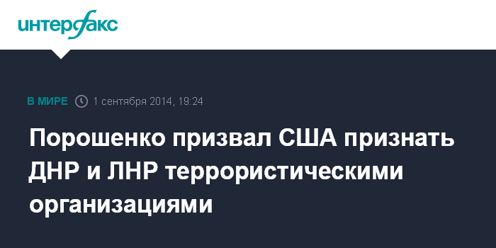 Порошенко также заявил о намерении во время визита в США во второй половине сентября поднять вопрос о признании ДНР и ЛНР террористическими организациями, отмечает пресс-служба.