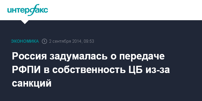 Москва. 2 сентября. INTERFAX.RU - Россия собирается передать (РФПИ) в собственность ЦБ, об этом агентству Bloomberg сообщили два источника, знакомых с планами фонда. Они предпочли не называть имен, так как эта информация является конфиденциальной. Сейчас РФПИ, капитал которого составляет $10 млрд, на 100% принадлежит ВЭБу, недавно попавшему под секторальные санкции ЕС и США.