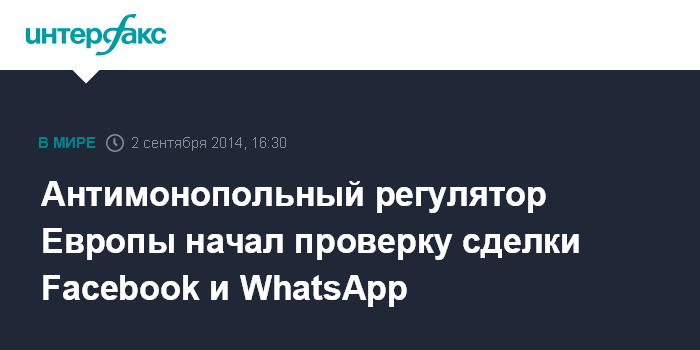 Facebook объявила о покупке WhatsApp за $19 млрд в феврале, и уже в апреле сделка получила одобрение Федеральной торговой комиссии США. Официальное уведомление было направлено в Еврокомиссию лишь 29 августа, и обычно регулятору требуется 25 рабочих дней на то, чтобы либо одобрить сделку, либо принять решение о проведении более детального анализа.