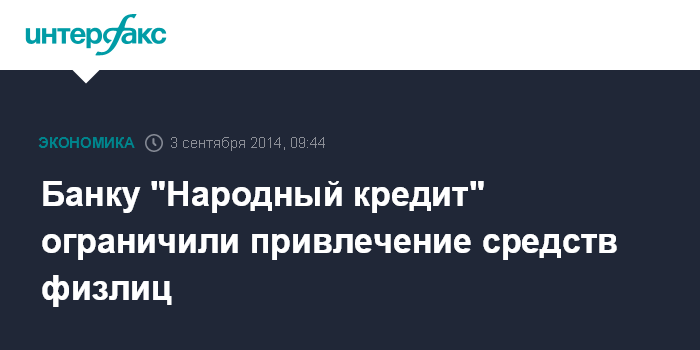 Москва. 3 сентября. INTERFAX.RU - Банк "Народный кредит" в июле получил предписание Центробанка, ограничивающее привлечение вкладов физлиц, пишет газета "Ведомости" со ссылкой источники в банковских кругах.