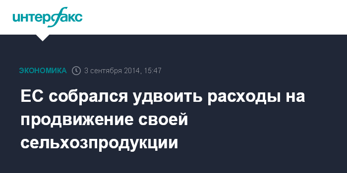 Москва. 3 сентября. INTERFAX.RU - Европейская комиссия в среду подтвердила намерение увеличить расходы на программы продвижения сельскохозяйственной продукции стран Евросоюза на 30 млн евро в год начиная с 2015 года в дополнение к уже выделенным 60 млн евро в год, говорится в сообщении ведомства.