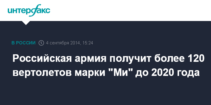 Москва. 4 сентября. INTERFAX.RU - Минобороны РФ до 2020 года получит более 120 вертолетов марки "Ми", заявил заместитель министра обороны Юрий Борисов. В четверг он прибыл в Ростов-на-Дону, чтобы проверить ход выполнения контрактов по гособоронзаказу на предприятии "Росвертол".
