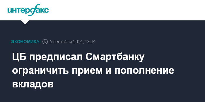 Москва. 5 сентября. INTERFAX.RU - Московский Смартбанк по предписанию ЦБ ввел ограничение на прием вкладов, а также их пополнение, говорится в сообщении кредитной организации.