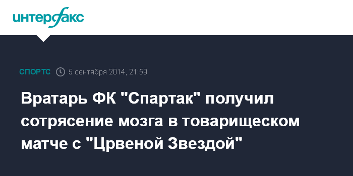 Москва. 5 сентября. INTERFAX.RU - Вратарь "Спартака" и сборной России по футболу Артем Ребров, замененный на 13-й минуте товарищеского матча с "Црвеной Звездой" на "Открытие Арене" в Тушино (1:1), получил сотрясение мозга, сообщил пресс-атташе национальной команды Илья Казаков.