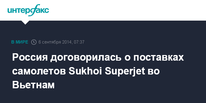 Москва. 6 сентября. INTERFAX.RU - В рамках 17-го заседания межправкомисии Россия-Вьетнам достигнута договоренность о поставках российских самолетов Sukhoi Superjet двум вьетнамским авиакомпаниям, заявил журналистам заместитель министра промышленности и торговли Виктов Евтухов.