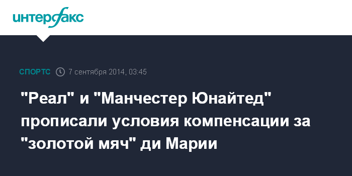 Москва. 7 сентября. INTERFAX.RU - "Манчестер Юнайтед" заплатит мадридскому "Реалу" 4 миллиона фунтов стерлингов, если аргентинского полузащитника Анхеля ди Марию признают игроком года, сообщила газета The Telegraph.