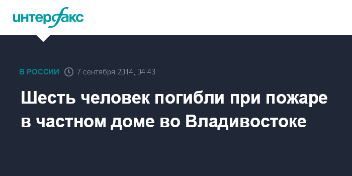 Москва. 7 сентября. INTERFAX.RU - Пожар в одном из частных домов во Владивостоке привел к гибели шести человек, сообщается на официальном сайте УМВД по Приморью.